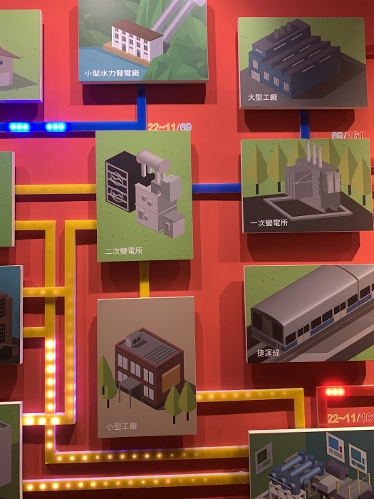 結束影片導覽後,接著來到一樓右側的時光走廊,牆上分別展示台灣電力發展史及世界電力發展史。