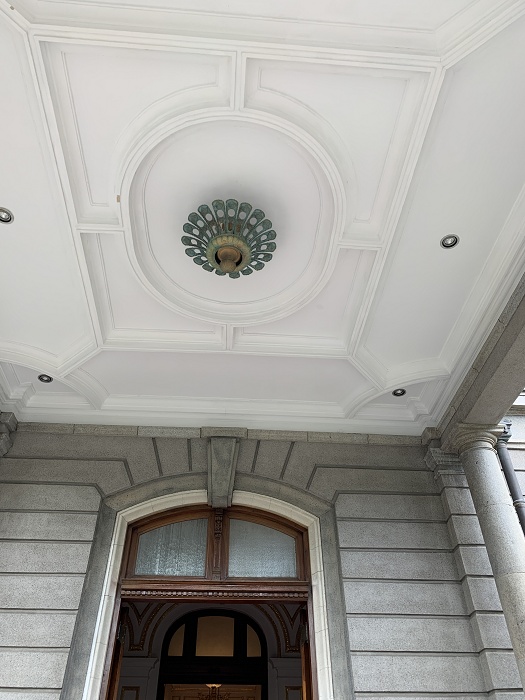 入口處,抬頭可看見這代表日本皇室的16瓣八重表菊紋,這裡卻有19片,猜測應該是刻意作出差異,畢竟賓館已隸屬我國建物。