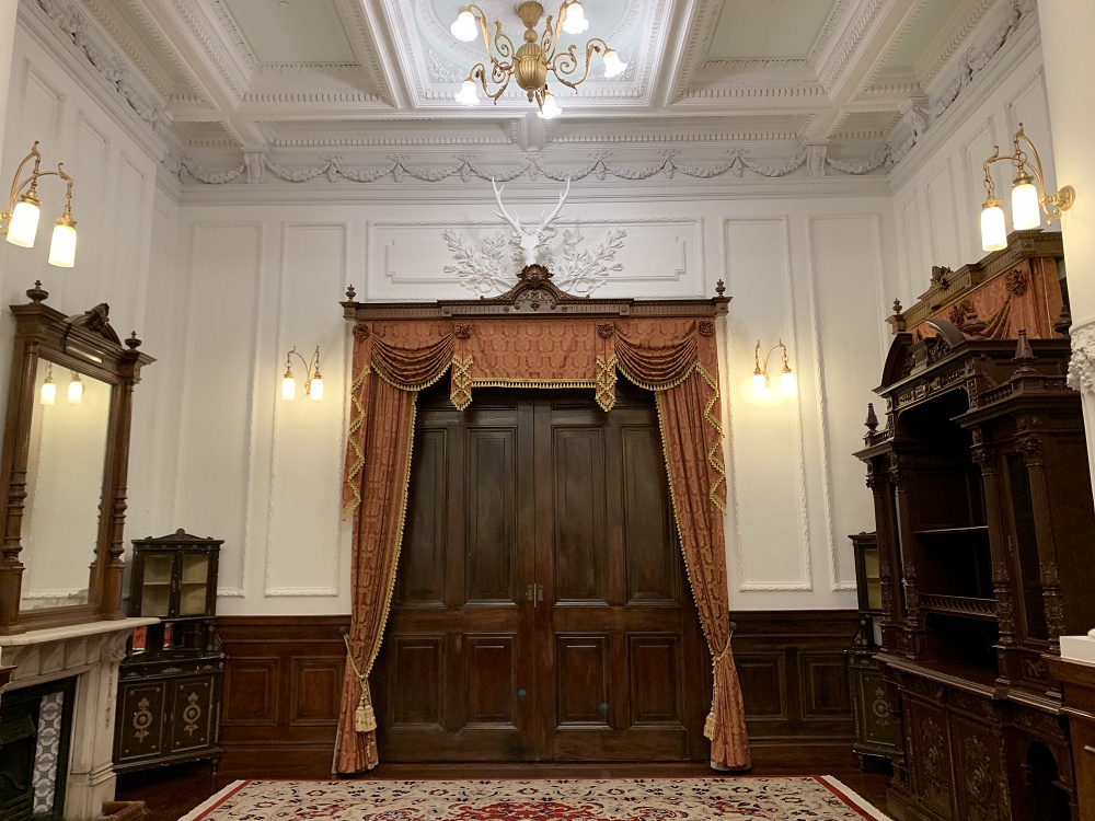 內部裝飾從天花板線腳、灰泥雕塑到水晶燈飾,無不精美,高級櫸木拼花地板、英國進口的維多利亞磁磚和壁爐,塑造成高貴的迎賓廳房。