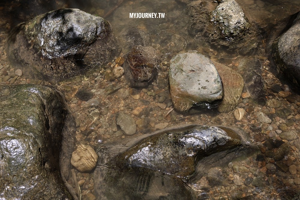 這裡的水質還算清澈,小魚不少,但石頭上可能有濕滑的青苔,爸媽記得提醒孩子,或是穿上溯溪鞋就更安全了。