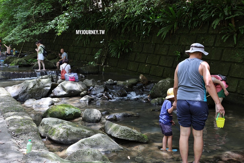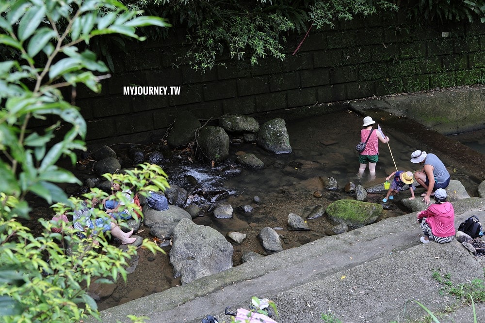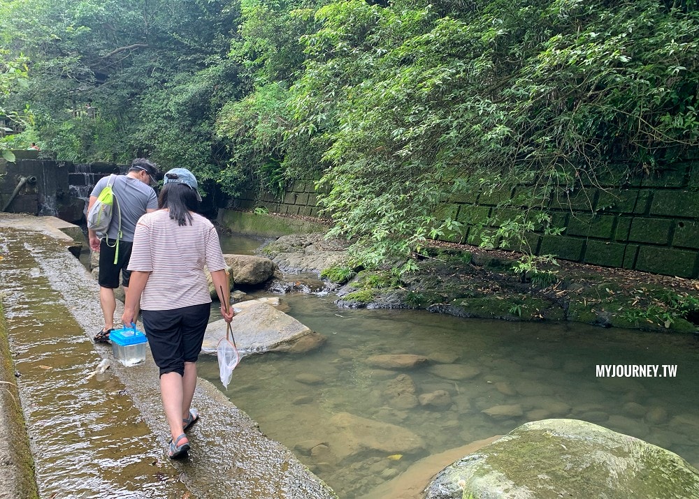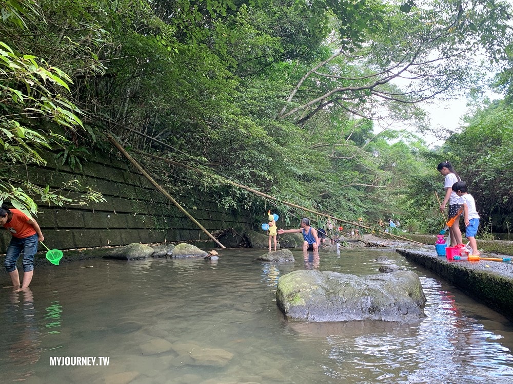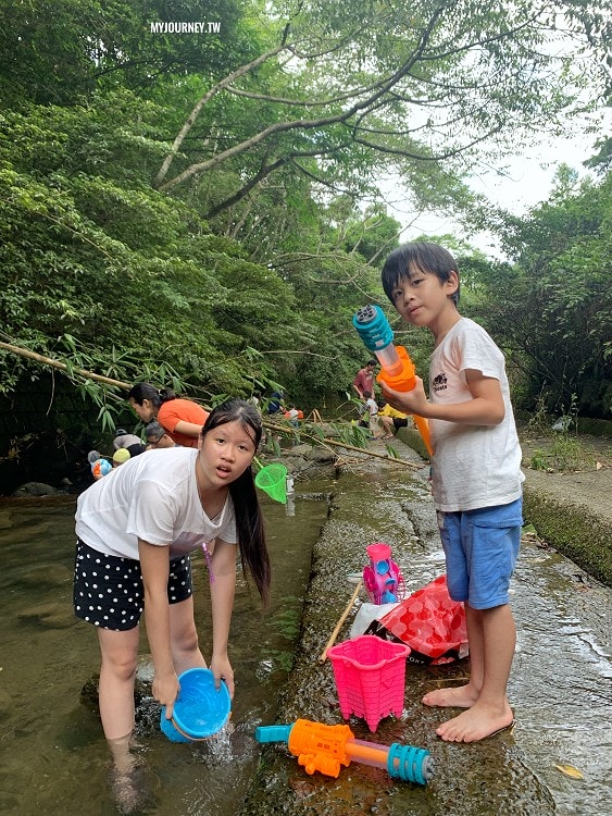 岸邊的水深約到孩子的小腿,生態豐富有魚、豆娘等,邊玩水邊尋寶太合孩子的胃口。