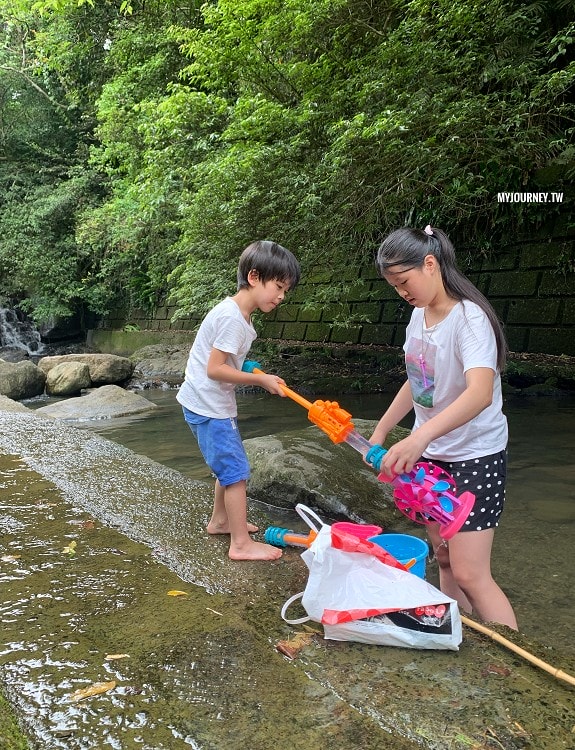 我們家姊弟倆不喜歡弄濕衣服,玩起水槍和找尋小魚的遊戲,大人、小孩各自放鬆。