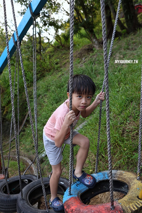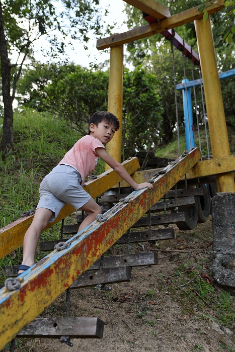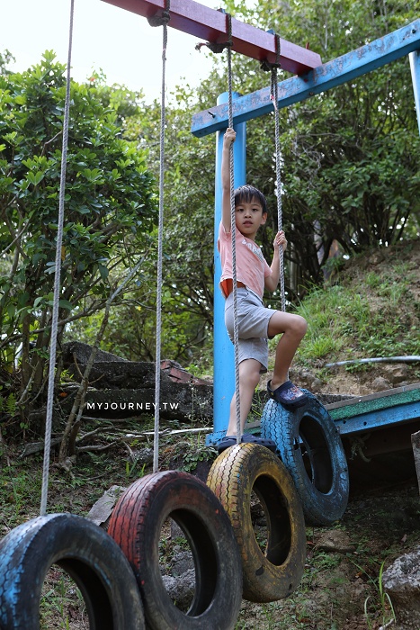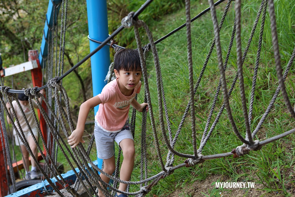 一路往上的闖關設施包含獨木橋、交叉繩索、搖搖輪胎和晃晃獨木橋,難度不高,小一的孩子應該就能過關。