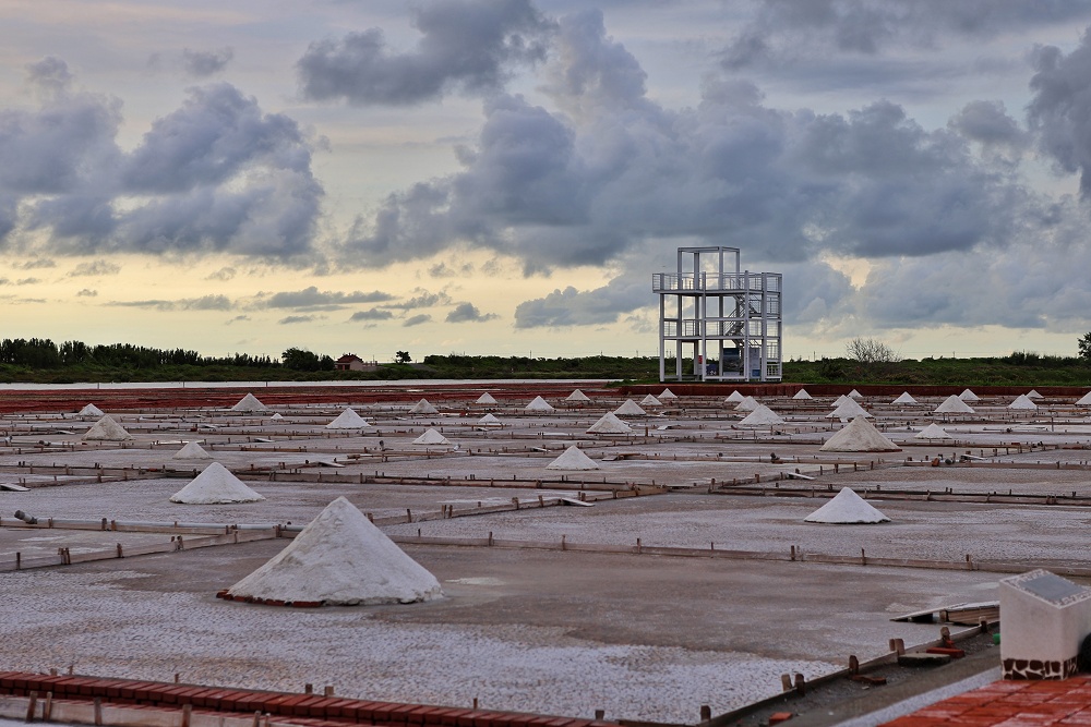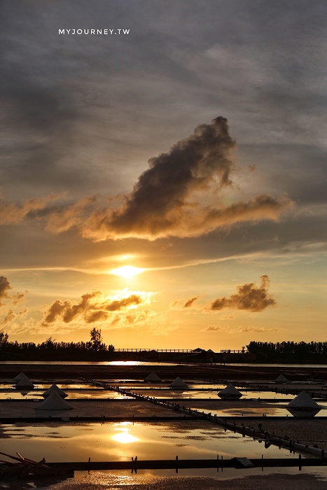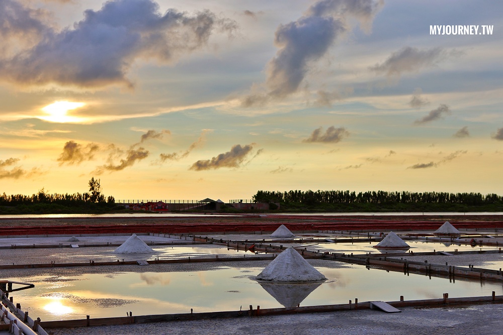 當太陽慢慢西下,整片鹽田反射金紅色光芒,雲彩、陽光與鹽田的倒影融合成一幅天然畫作。