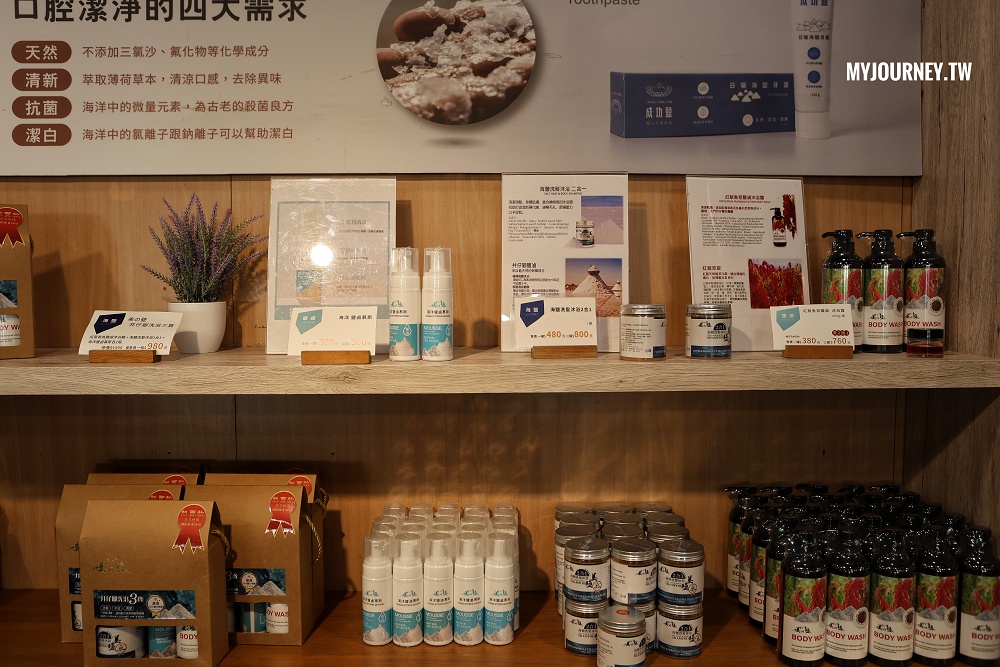 鹽田旁的店家非常貼心,除了販售各種手工鹽與調味品外,還提供免費試用與小吃體驗。